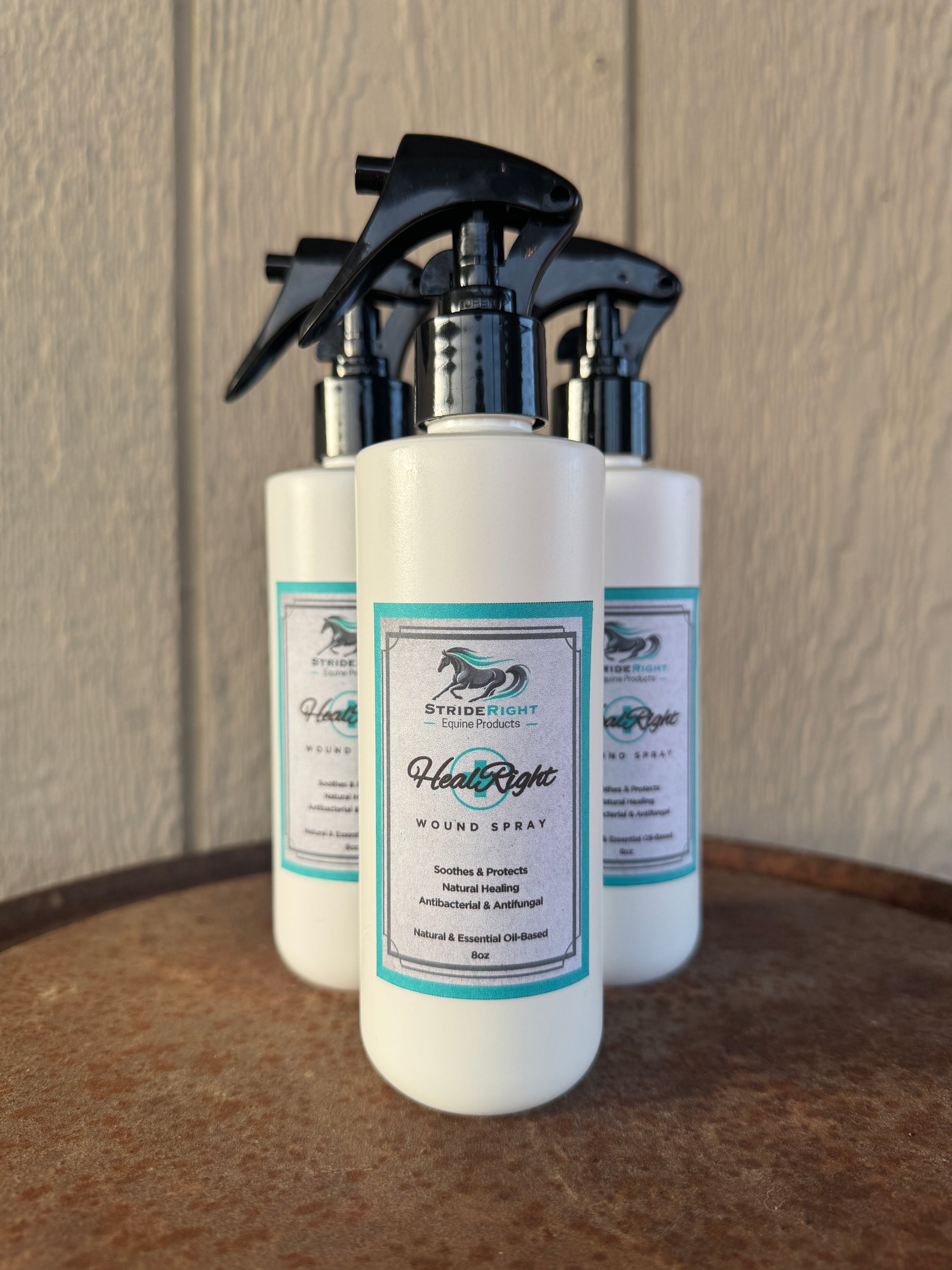 HealRight Wound Spray is a 8oz plant-based antimicrobial spray designed to cleanse, soothe, and protect your horse’s skin. Formulated with witch hazel, aloe vera, colloidal silver, and essential oils like lavender and tea tree, it helps reduce inflammation, fight bacteria, and promote faster healing of cuts, scrapes, bites, and skin irritations—without the burn of alcohol or chemicals.